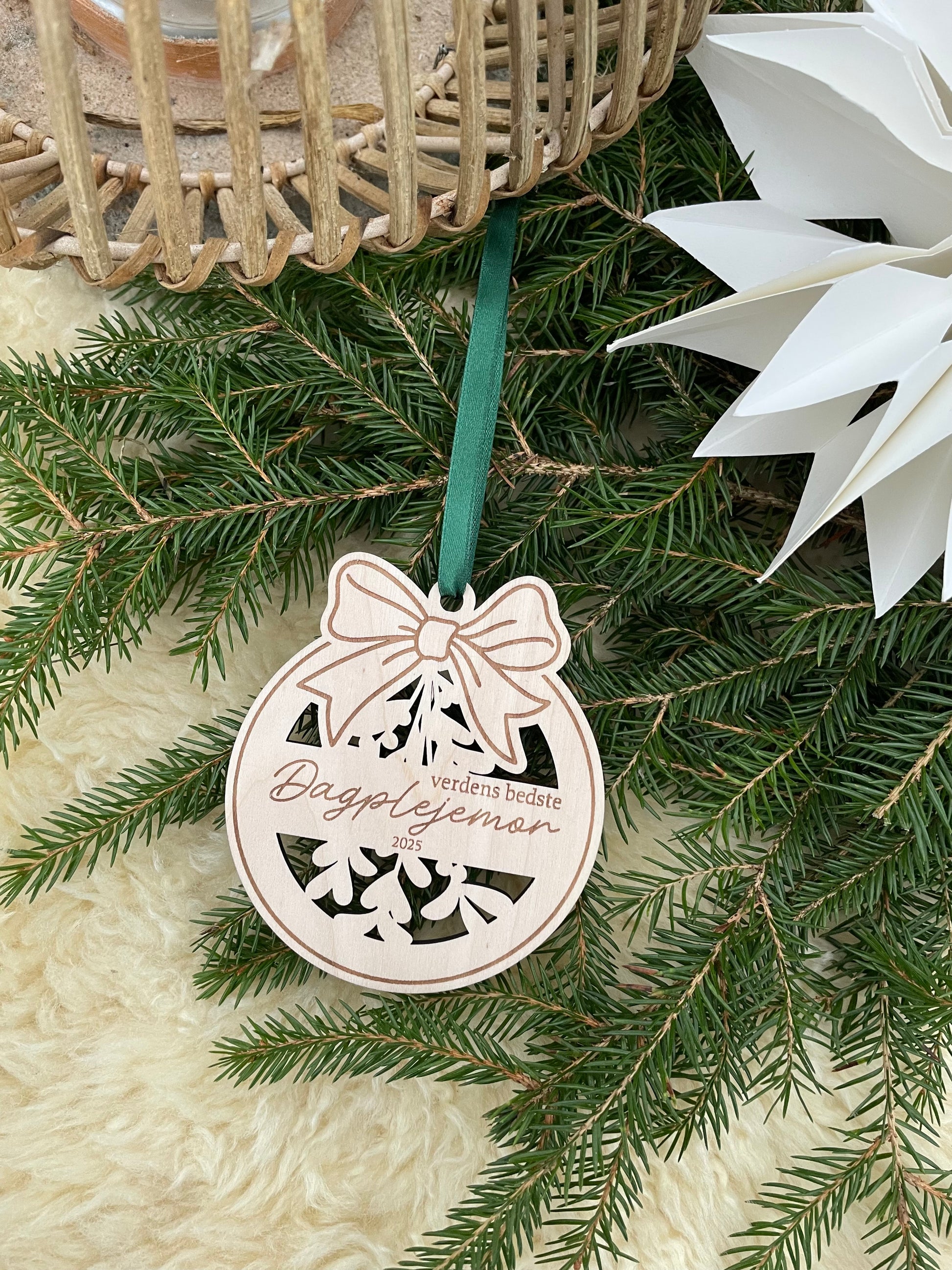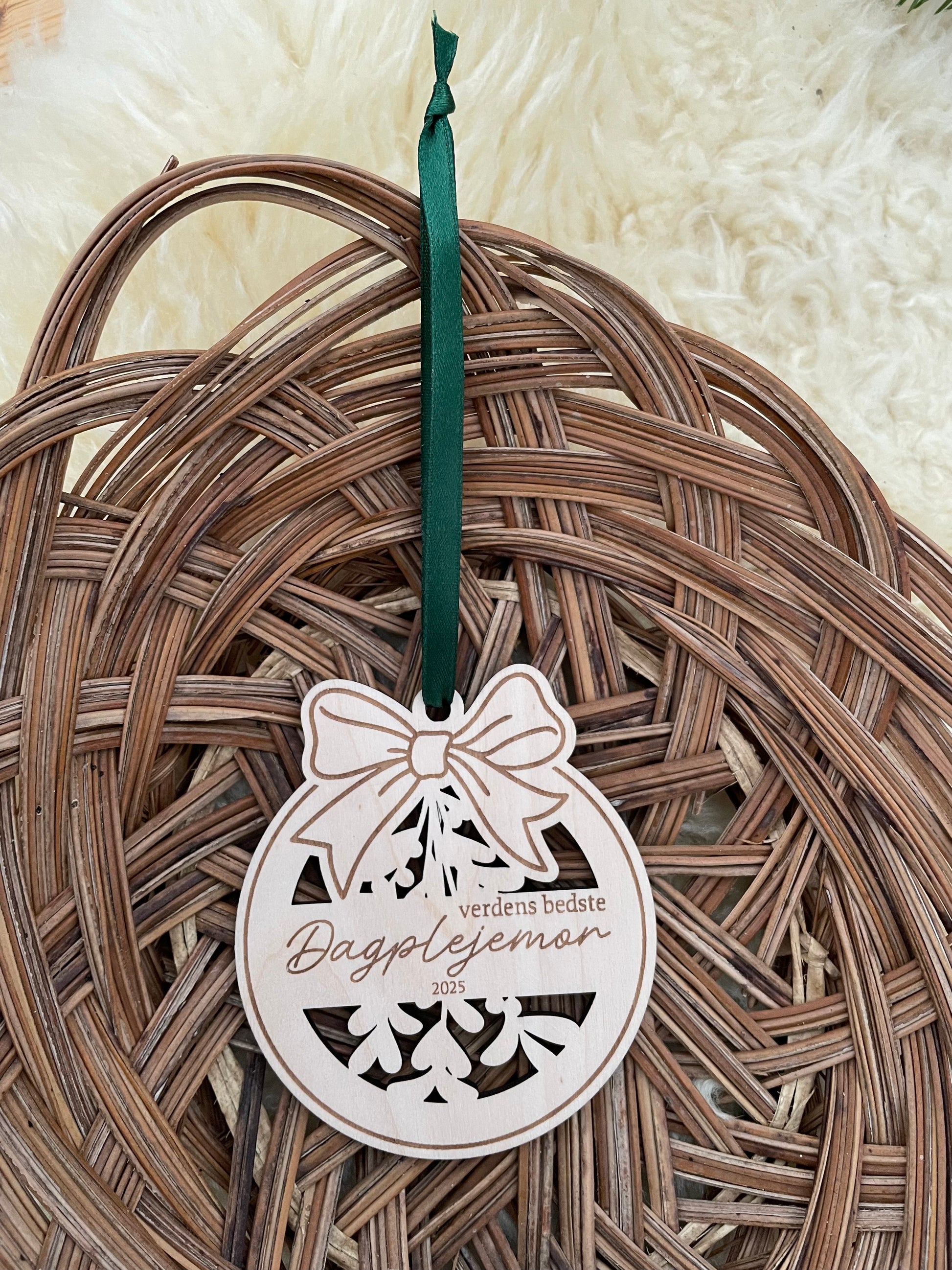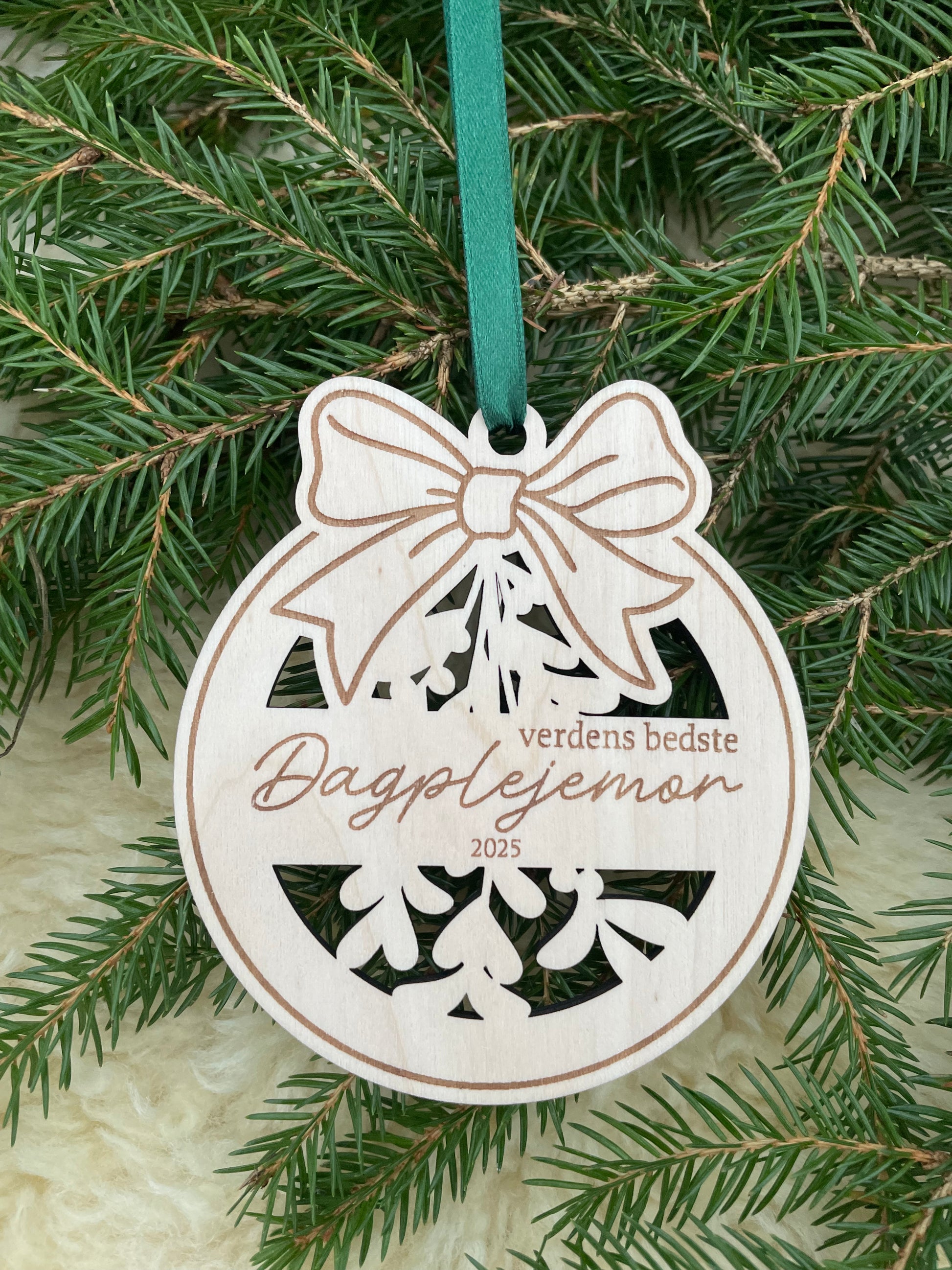 Giv jeres Dagplejemor en helt personlig julegave som tak for hendes indsats, med denne julekugle i 3 mm birkefiner. Kuglen er dekoreret med en elegant sløjfe og mistelten, med teksten “Verdens bedste Dagplejemor”.