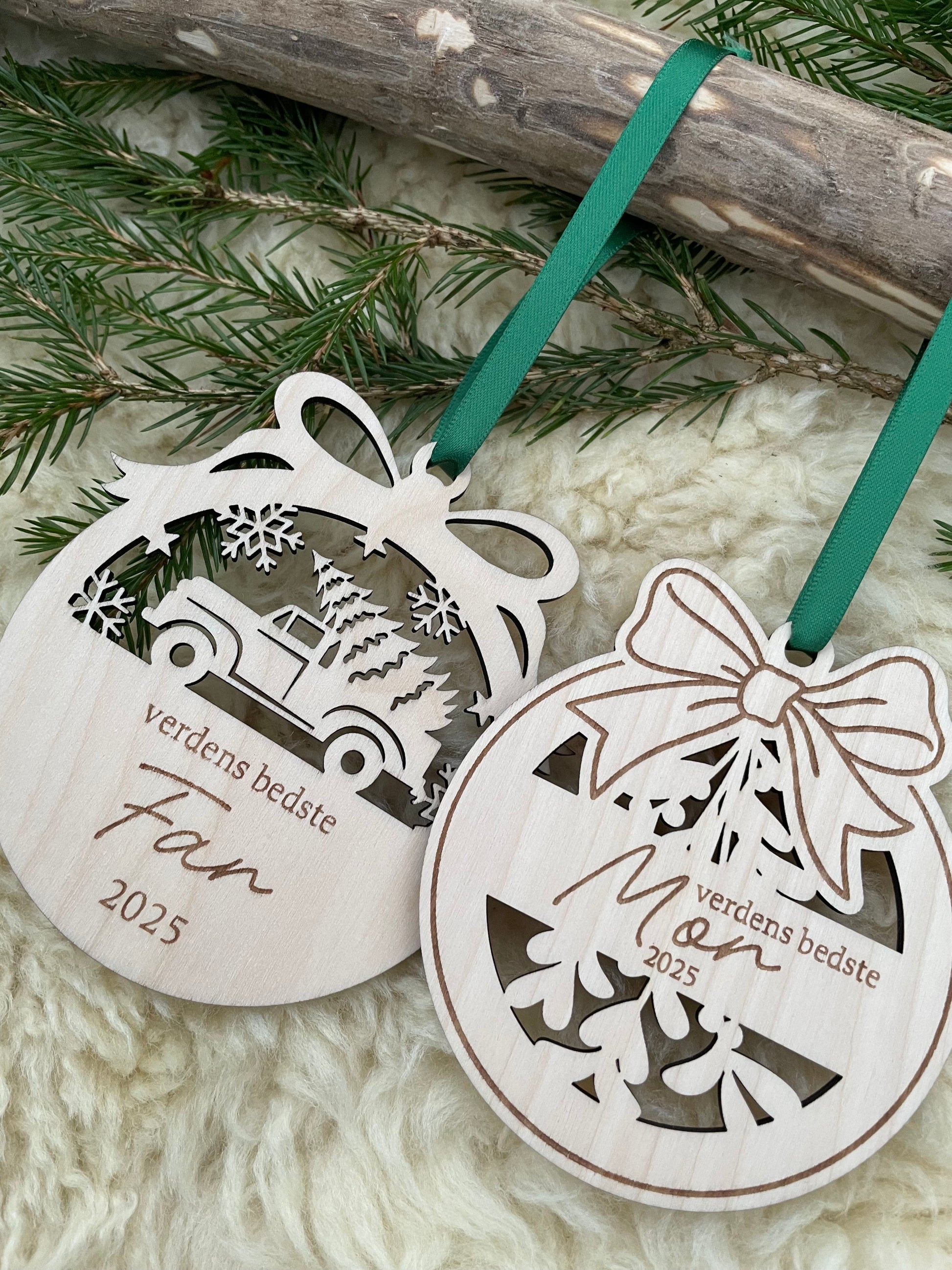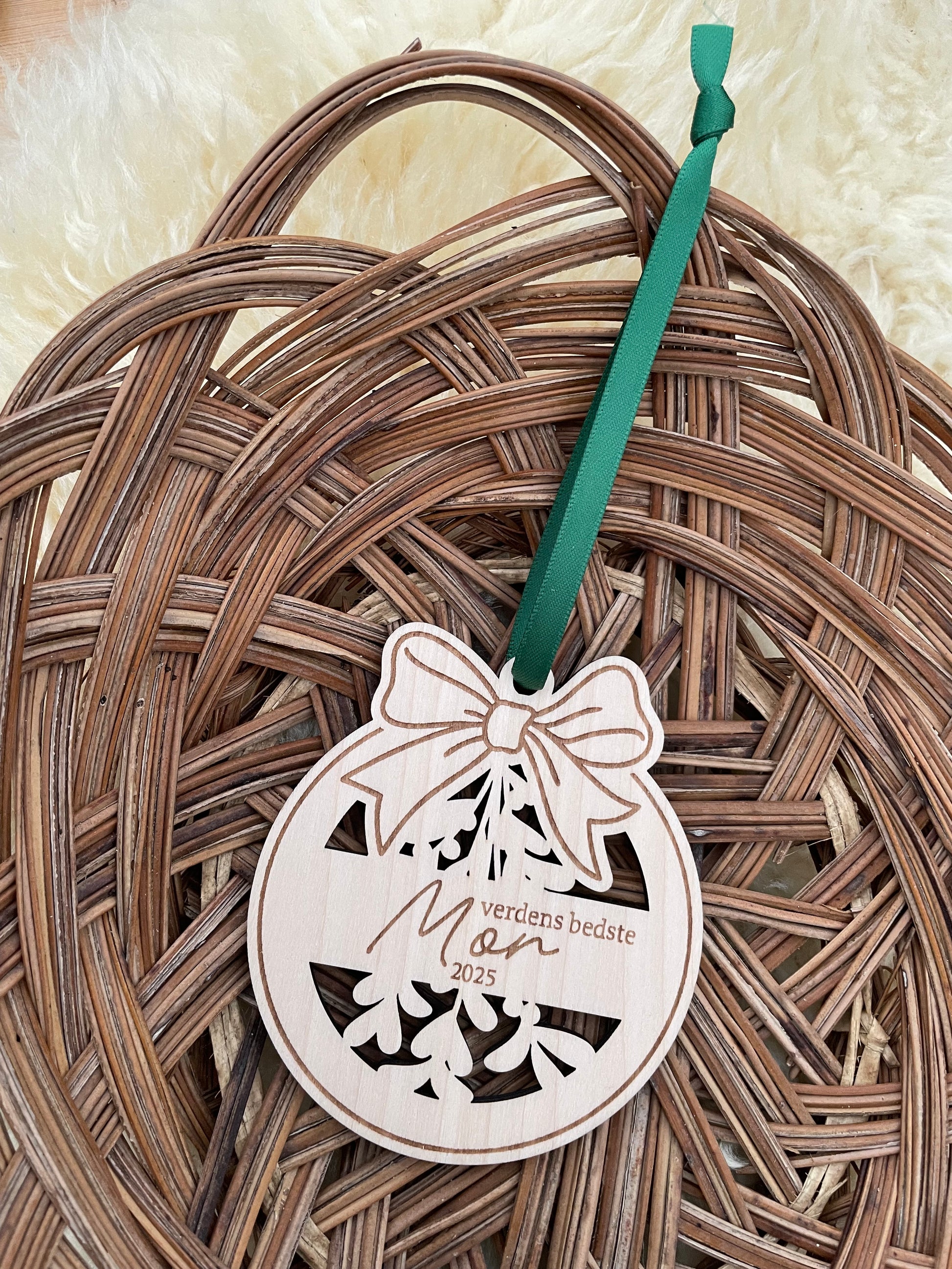 Giv Mor en helt personlig julegave med denne julekugle i 3 mm birkefiner. Kuglen er dekoreret med en elegant sløjfe og mistelten, med teksten “Verdens bedste Mor”.