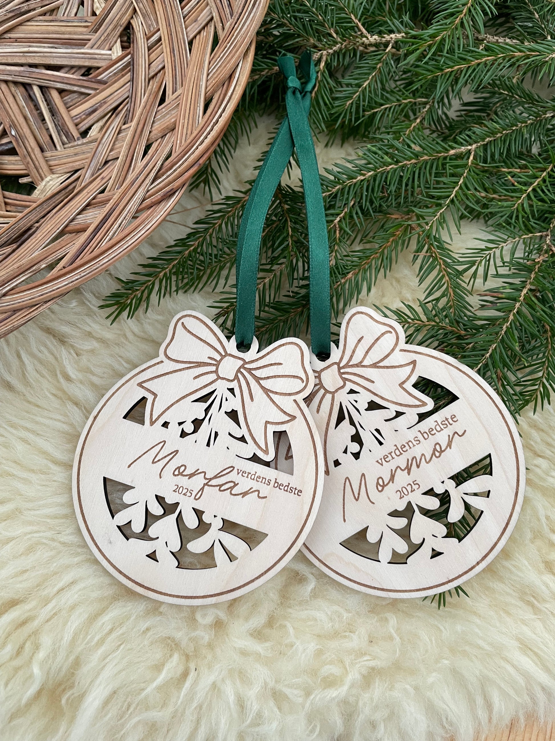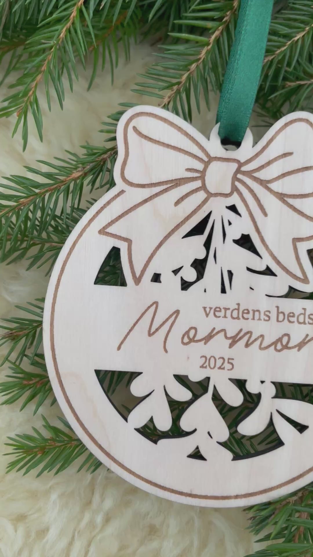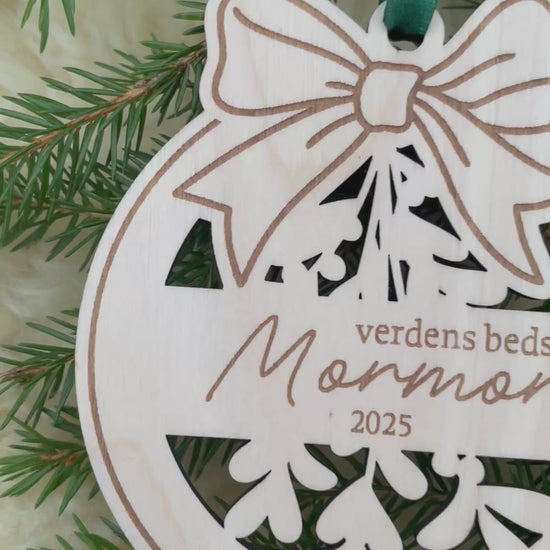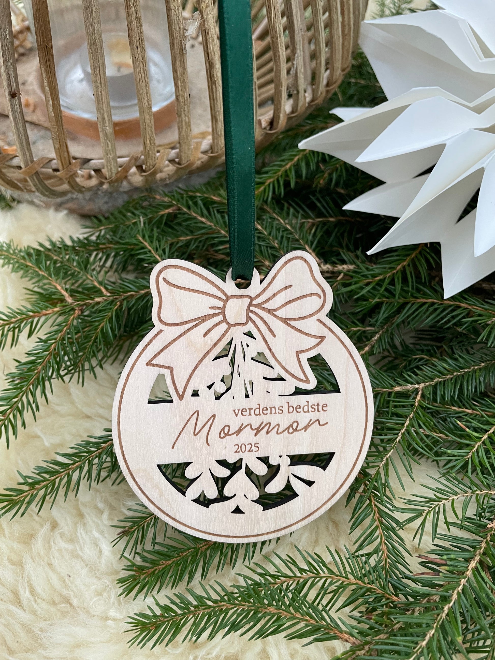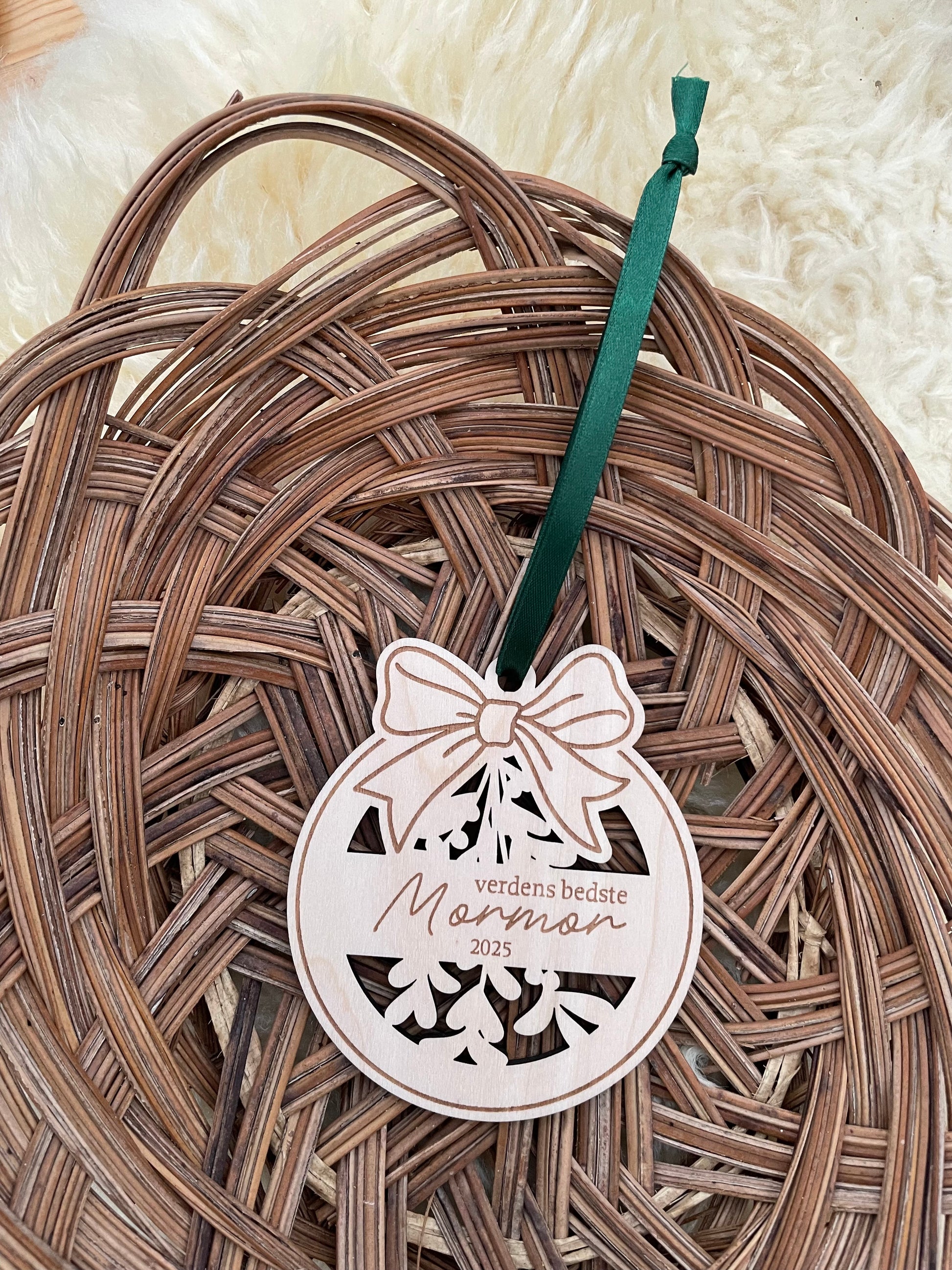 Giv Mormor en helt personlig julegave med denne smukke julekugle i 3 mm birkefiner. Kuglen er dekoreret med en elegant sløjfe og mistelten, med teksten “Verdens bedste Mormor”.
