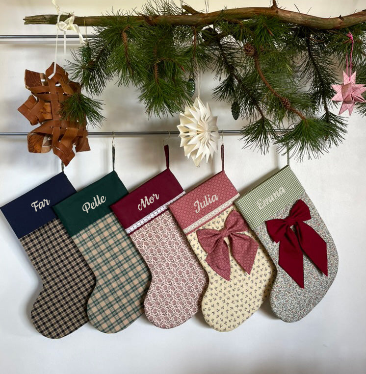 Julesok med navn, håndlavet i Danmark. Skab en hyggelig jul med personlige julesokker. Giv en unik og personlig gave til en du holder af. Hver julesok er håndsyet og findes kun i begrænset antal. 100% cotton