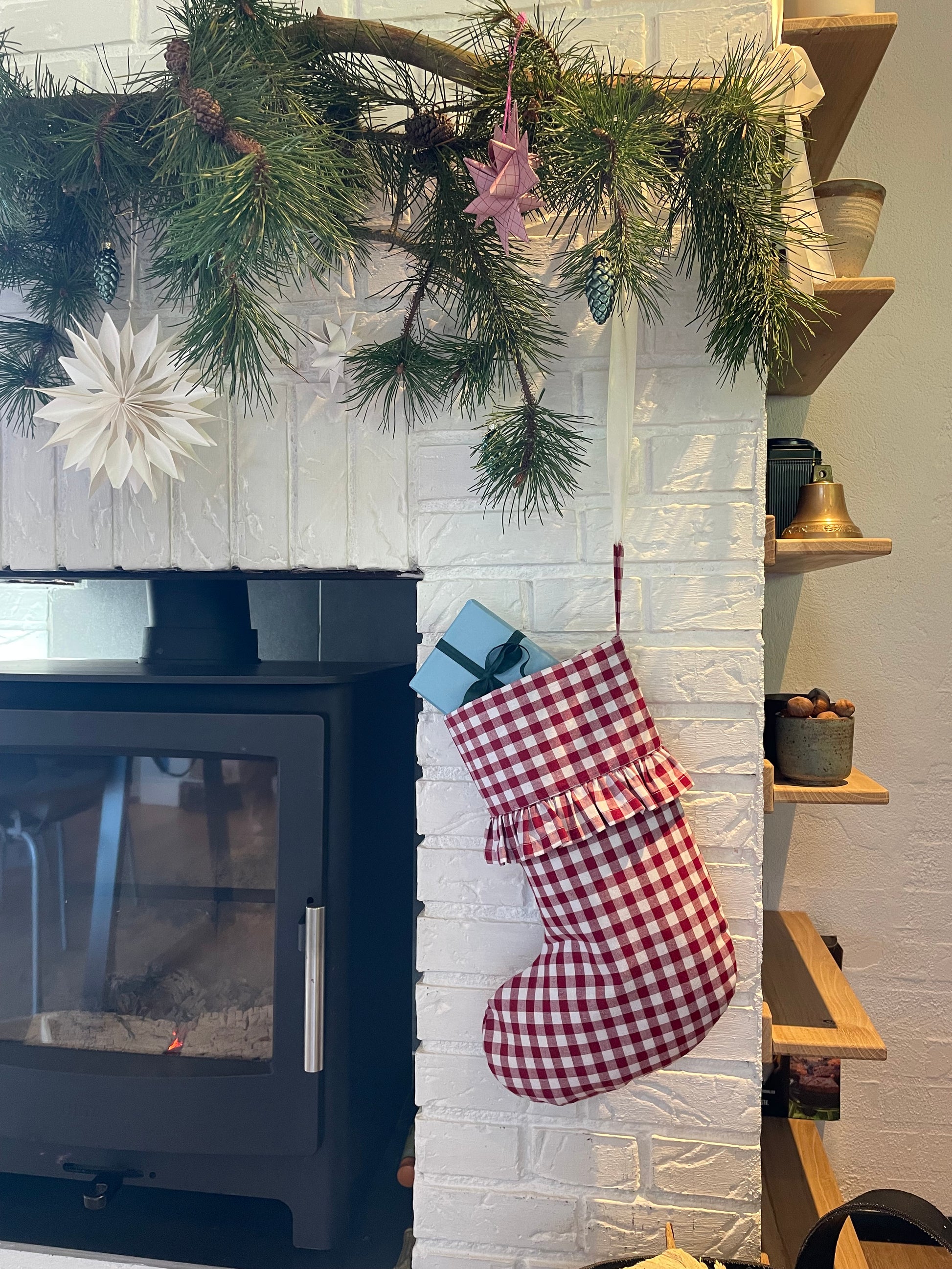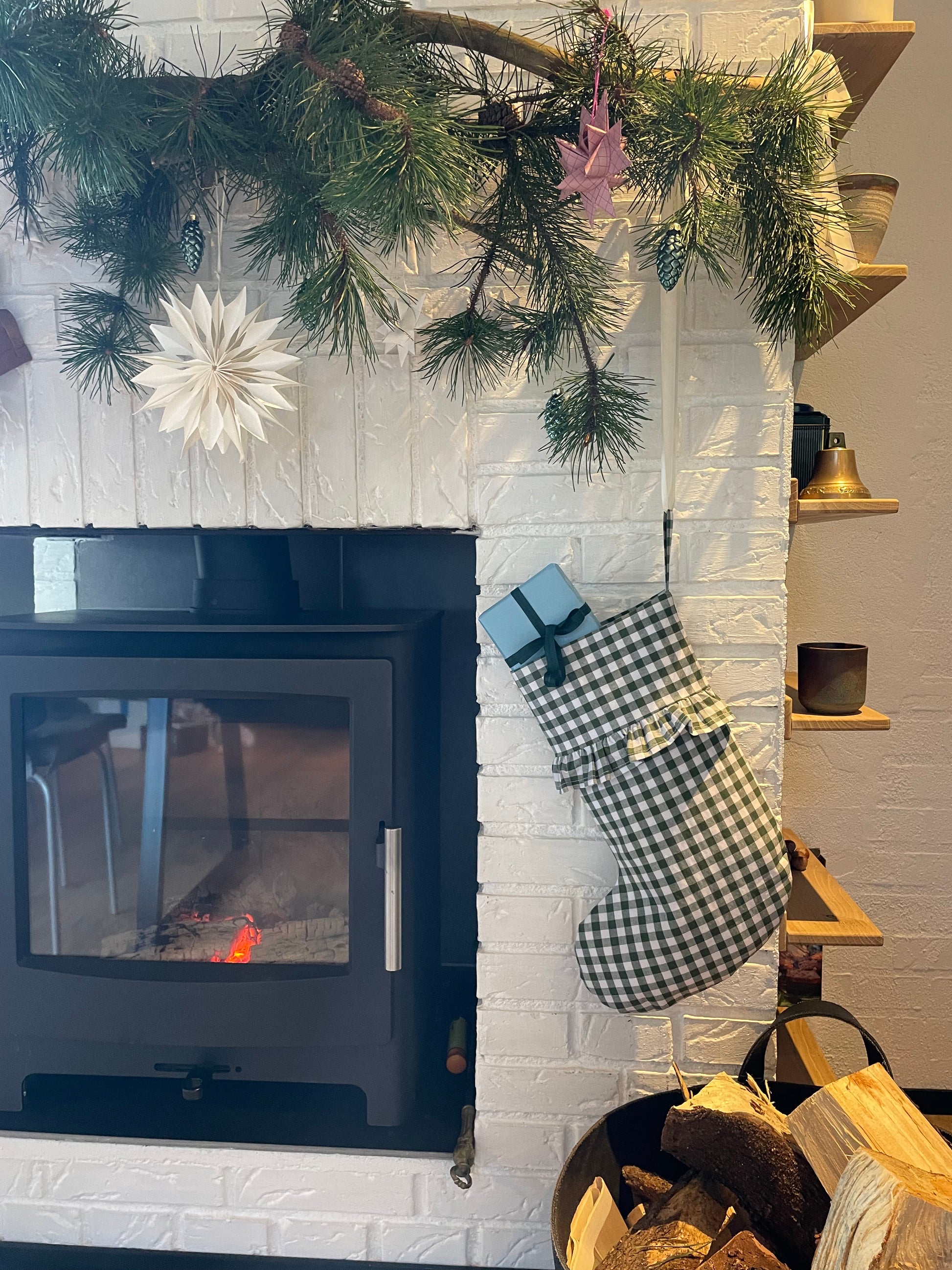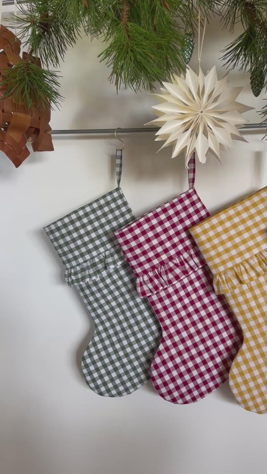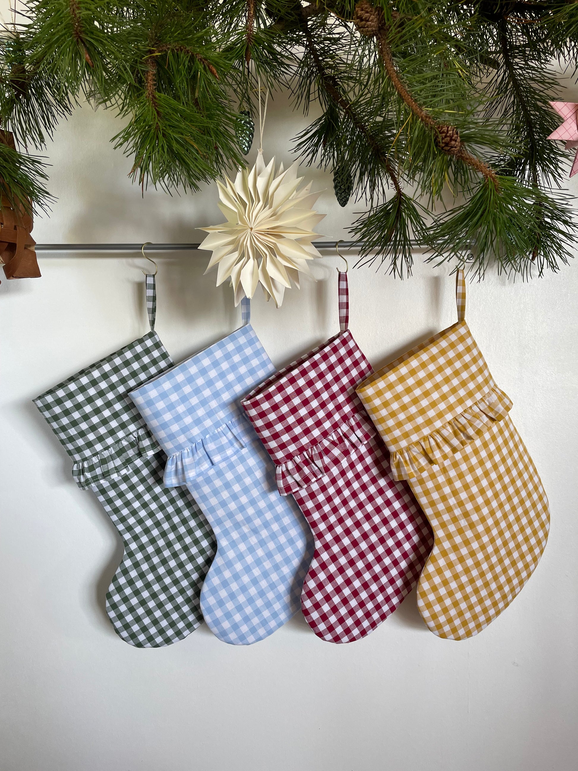 Julesok i ternet stof. Måske du kender en lille eller stor som vil blive glad for sin helt egen julesok? Hver julesok er håndsyet og findes kun i begrænset antal. 100% bomuld. Det er muligt at tilkøbe et lille navneskilt i træ til sokken.